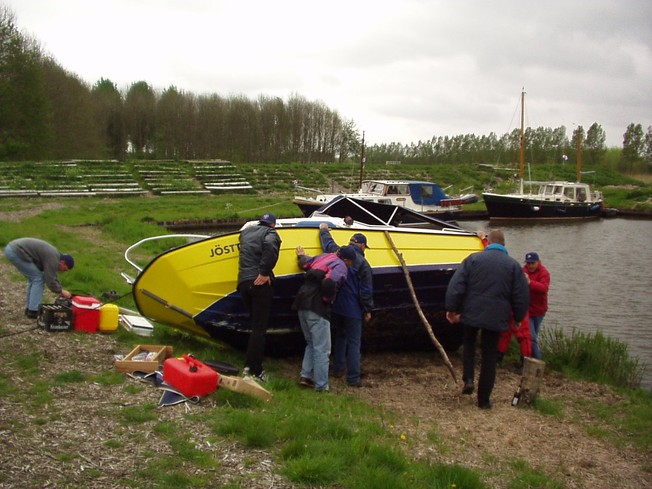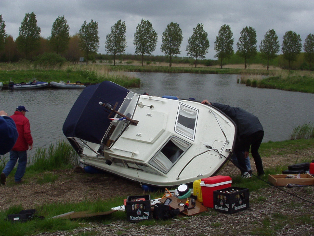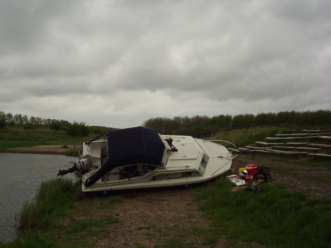 News Havarie!!! Alle Mann an (Deck) Land Das Boot von einem Kollegen hat es erwischt. Mitten in der Fahrrinne beschädigt ein unbekannter Gegenstand den Rumpf. Schnell dringt Wasser ein und es muß gehandelt werden. Die Bilder sprechen glaube ich für sich.
